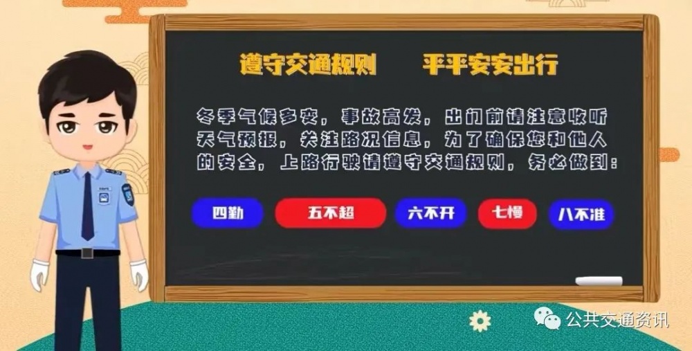 冬季氣候多變,事故高發(fā),出門前請注意收聽天氣預(yù)報,關(guān)注路況信息,為了確保您和他人的安全, 上路行駛請遵守交通規(guī)則,務(wù)必做到:四勤、五不超、六不開、七慢、八不準(zhǔn) 。