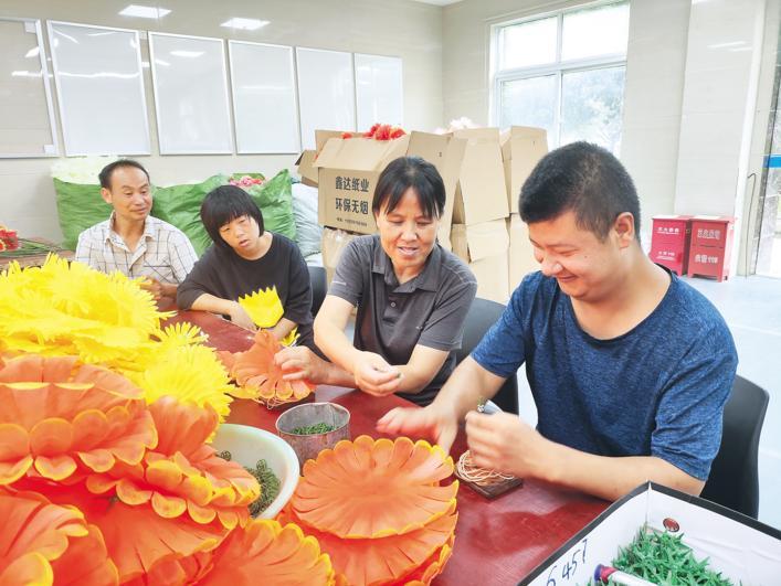 荊門市圓夢殘疾人庇護工場內(nèi),孟麗華(右二)正教殘疾朋友進(jìn)行手工制作。