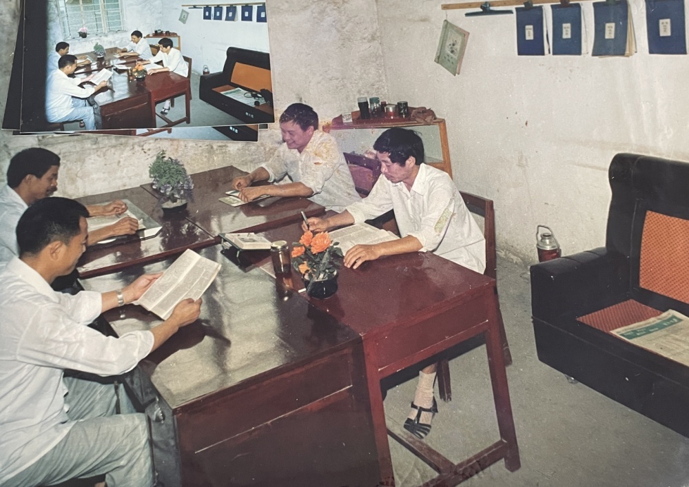 ▲80年代,機(jī)關(guān)辦公室工作場景。新舊都不一樣的四張桌子拼成一張大長桌,大家面對(duì)面圍坐著辦公。桌面上的兩盆鮮花植物,算是為數(shù)不多的裝飾。