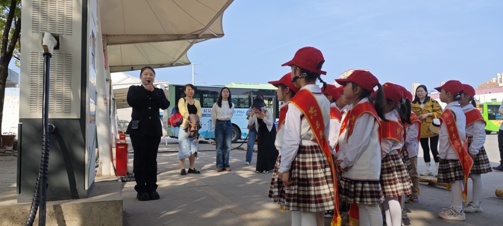 圖/在公交充電站,工作人員向同學(xué)們介紹充電樁的工作原理和純電動公交車的運(yùn)行優(yōu)點。