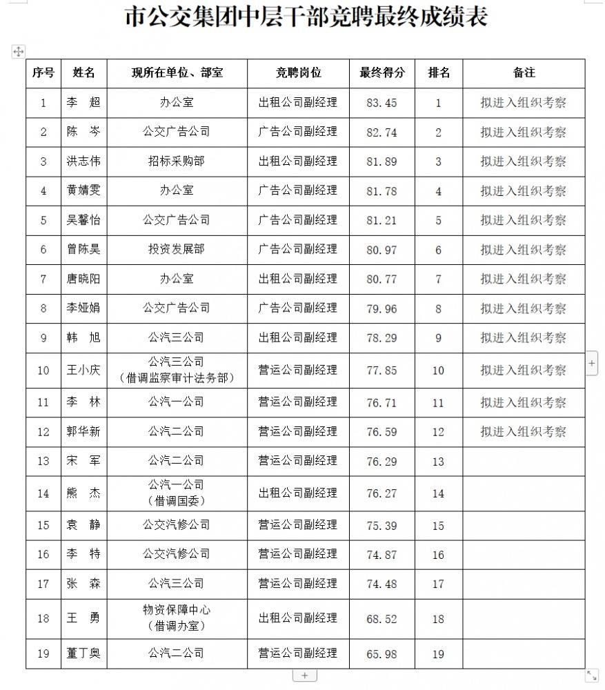 經(jīng)報名、資格審核、筆試、面試等環(huán)節(jié),共有12名競聘者(最終得分前12名)進入組織考察環(huán)節(jié),現(xiàn)將最終成績公示如下(見附件)。